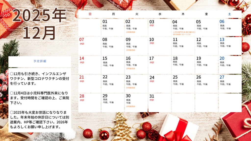○2025年も大変お世話になりなりました。年末年始の休診日については別途案内、HP等ご確認下さい。2026年もよろしくお願い申し上げます。