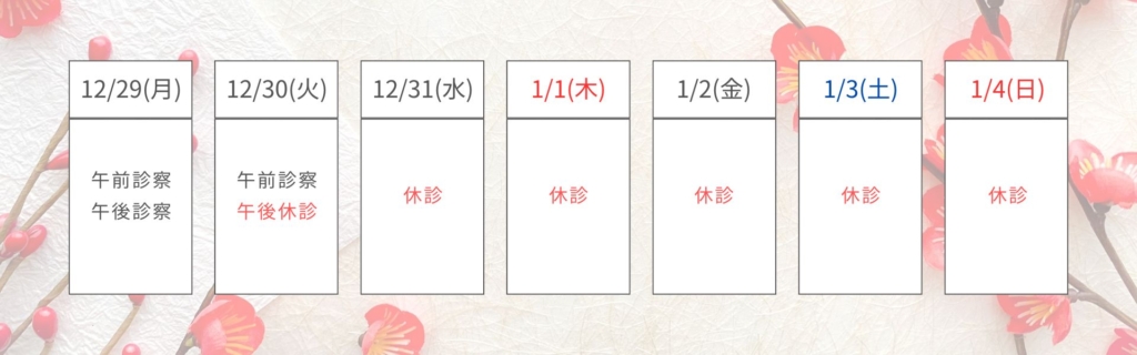 年末年始のお休みのご案内 2025.11.11 Tweet Share Hatena Pocket RSS feedly Pin it この記事のタイトルとURLをコピーする 年末年始は、休診日がございます。 30日は午前中のみ、12月31日、1月1日、2日、3日、4日は休診となります。 ご確認をよろしくお願い申し上げます。 Tweet Share Hatena Pocket RSS feedly Pin it この記事のタイトルとURLをコピーする コロナウイルス定期予防接種&インフルエンザワクチン接種のご案内 前の記事